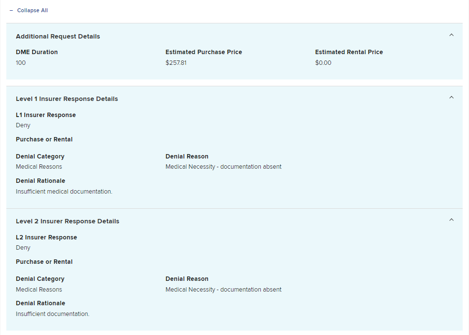 Further information about each review response can be seen by expanding the blue highlighted sections of Additional Request Details, Level 1 Insurer Response Details, and Level 2 Insurer Response Details. In this example, all sections are expanded.