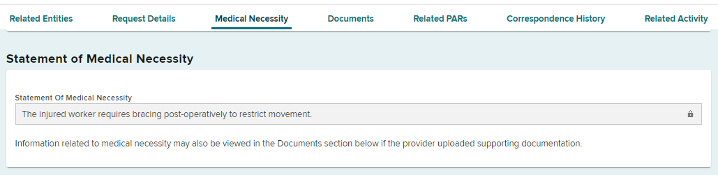 The Medical Necessity section will show the medical necessity entered in the text field during a PAR submission. If a statement of medical necessity is attached instead of entered on the eForm, this section will be blank. To see the attached statement of medical necessity, go to the Documents section.