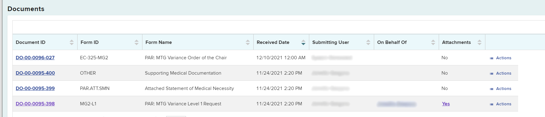 To view the document generated by the eForm submission, select the link from the eForm Document column. You can print or download a copy by selecting the Actions button in the corresponding row.