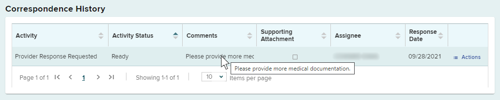 Correspondence History will show correspondence between the provider and the claim administrator when there is a request for additional information. The Comments column will show the details of the request. To view the full text, hover your mouse over the response text until a box with the full request details appears or select the Actions button.