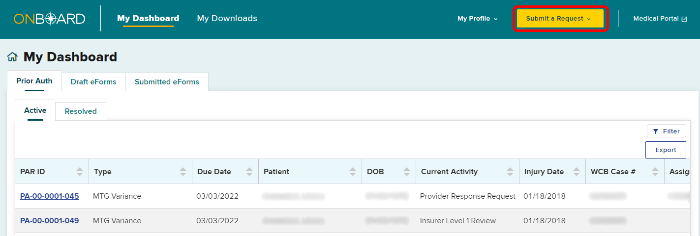 Within your dashboard, you can view the recently submitted item in the Prior Auth > Active tab. The Due Date column will update with the date the claim administrator is required to respond. All time frames for claim administrator review and response are automatically tracked by the system. If the claim administrator does not respond within the designated time frame, an Order of the Chair may be issued.