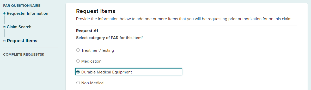 If multiple DME items are being requested for the patient, they can be added by selecting the Add Another Item button and selecting Durable Medical Equipment, then completing the necessary information for that DME item. All DME requests will be processed as a single PAR.