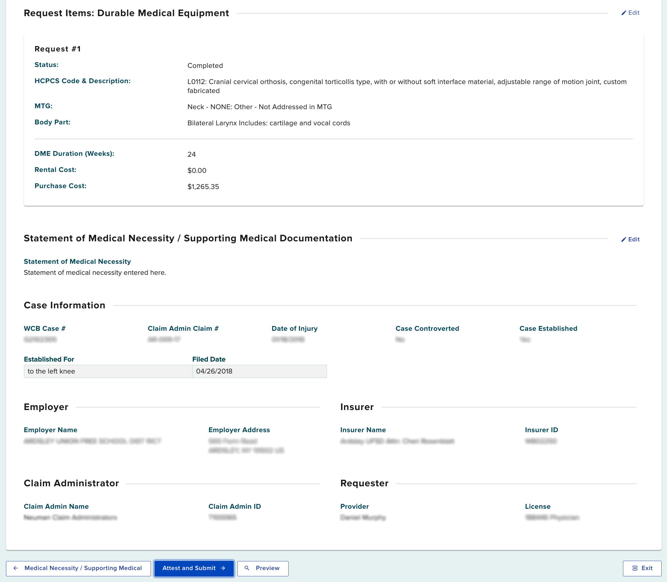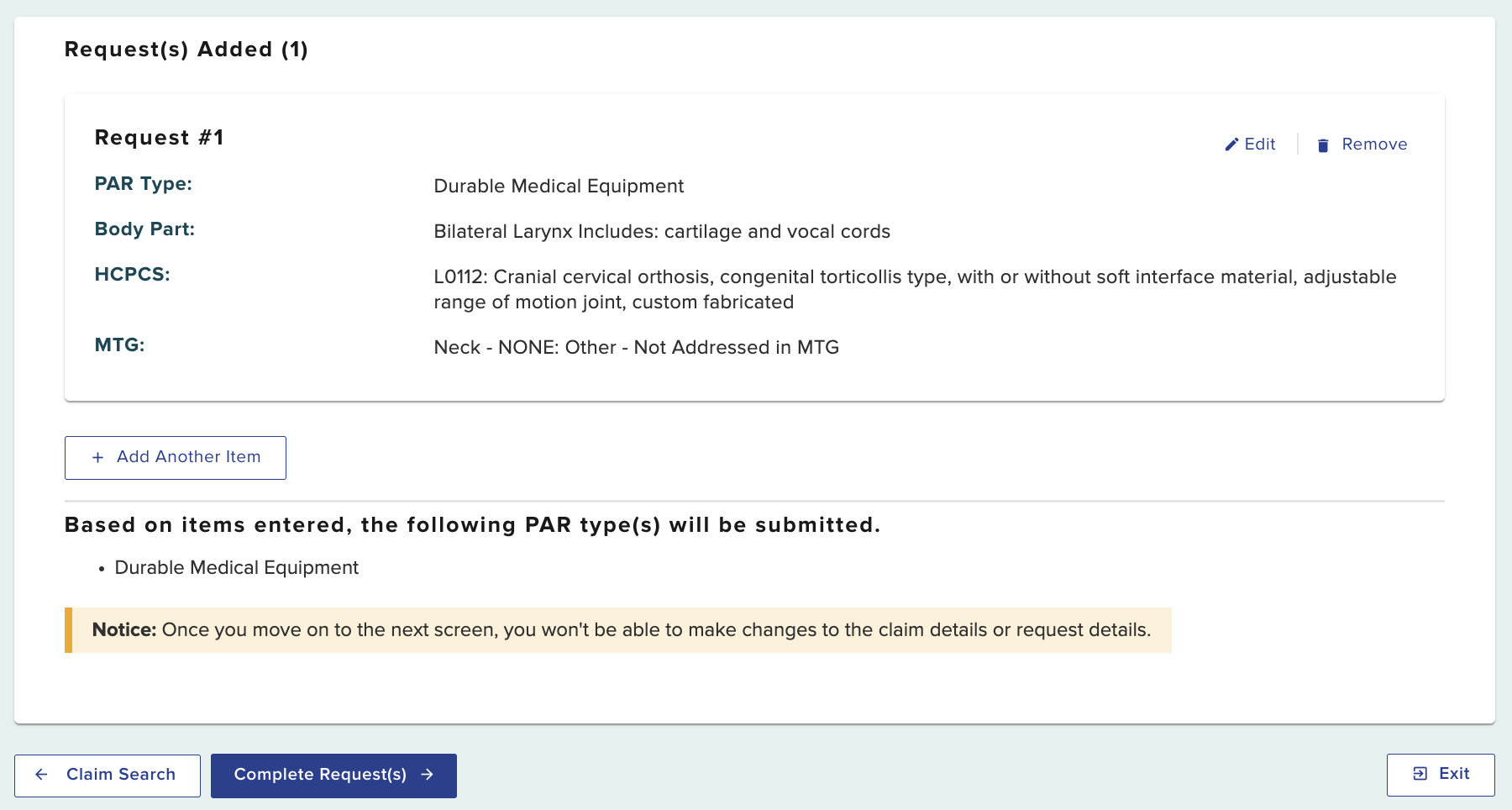 If you need to change any information previously entered, select the edit button. If you do not want to submit a request for a DME item, you may remove it. Once you move to the next screen to complete the request, you will not be able to make changes to the request details.