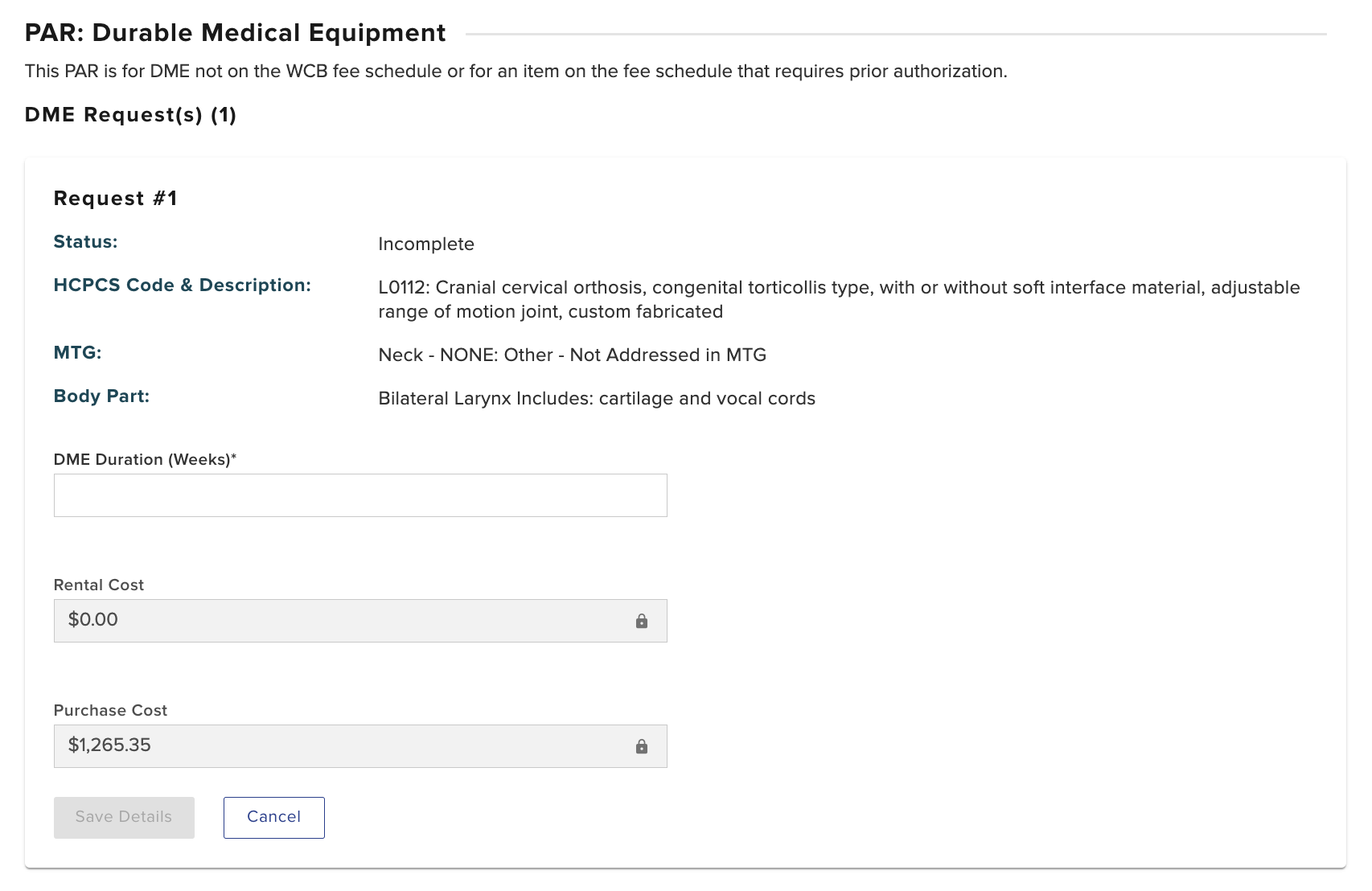 Select the Add Details button to enter additional details for your DME request.