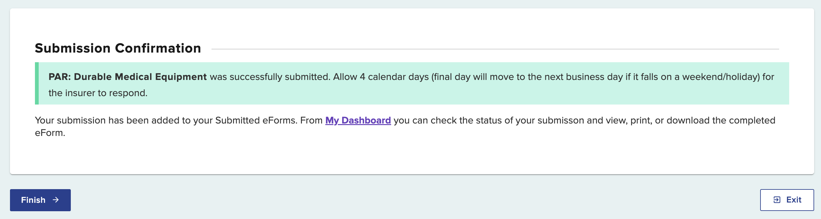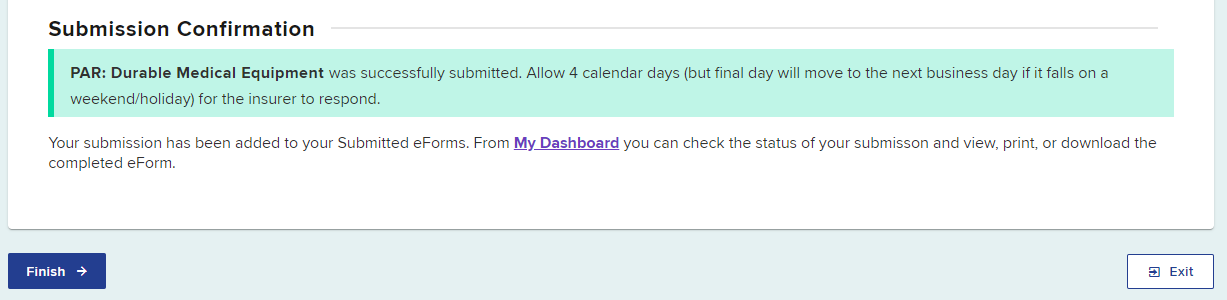 A confirmation page will show, confirming your DME PAR submission, which includes the time frame for an expected response.