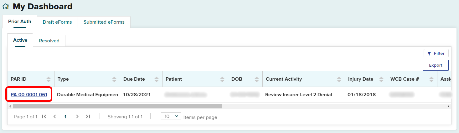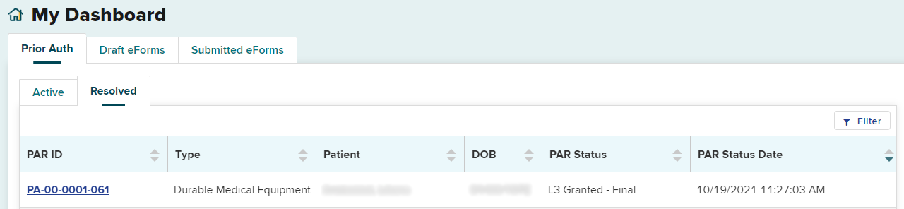 When a final determination is made on a PAR, it will be moved to the Resolved queue. When a PAR contains multiple requests, it will reach final determination once all request items in the PAR have reached a final determination. For example, if one DME request is granted and the other DME request is denied at the level 1 review, both requests will move to level 2 review and if escalated by the health care provider, to level 3 review (Board’s Medical Director’s Office) together. Once all requests within the PAR have received a final determination, the PAR will moved to the Resolved tab of the dashboard. It is recommended to check your Resolved tab for final decisions daily.