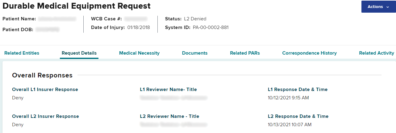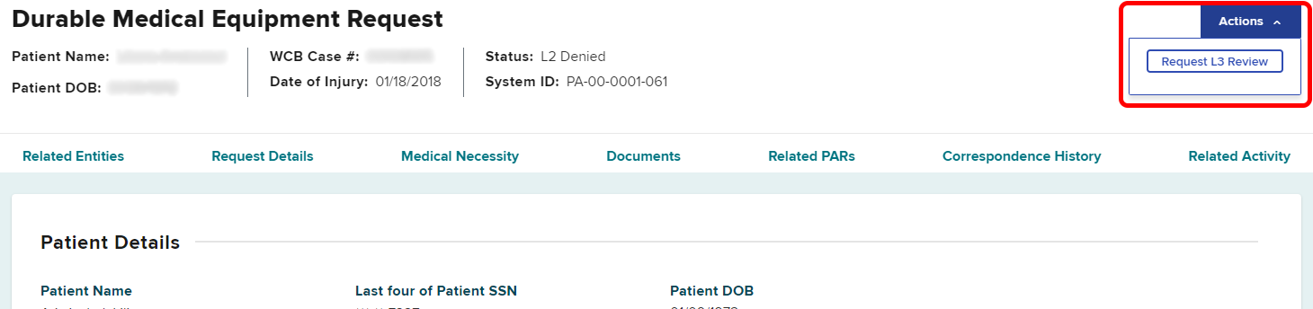To escalate to Level 3 review, select the PAR ID in that item’s row. Select the Actions button on the top right of the PAR Details page and select Request L3 Review.