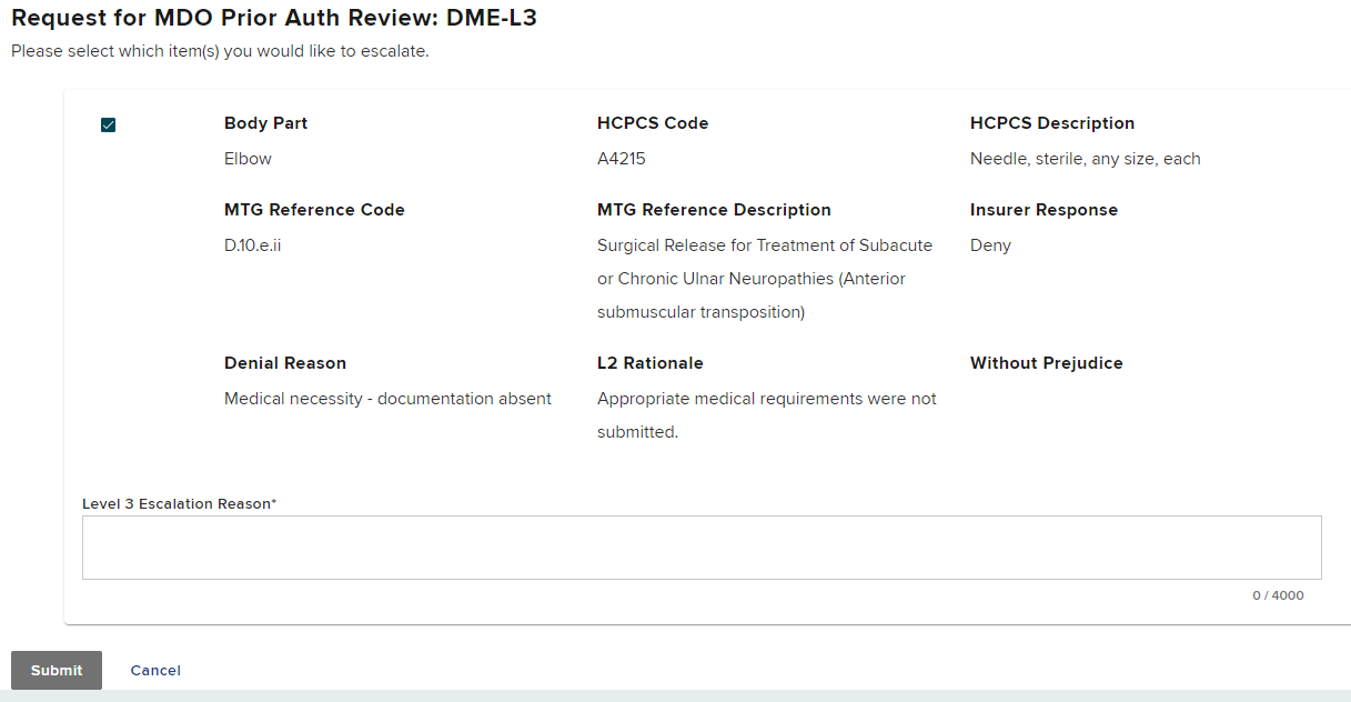 Select the item(s) you would like to escalate, enter the reason for the Level 3 escalation in the text box, and select Submit.