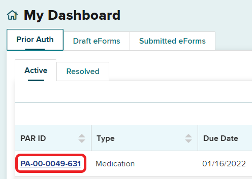 To access the documents, select the link to the PAR ID from the Prior Auth > Active and Resolved tabs, or the eForm Document link from the Submitted eForms tab. Request for Decision on Unpaid Medical Bill(s) (Form HP-1.0) documents can only be accessed from the Submitted eForms tab.