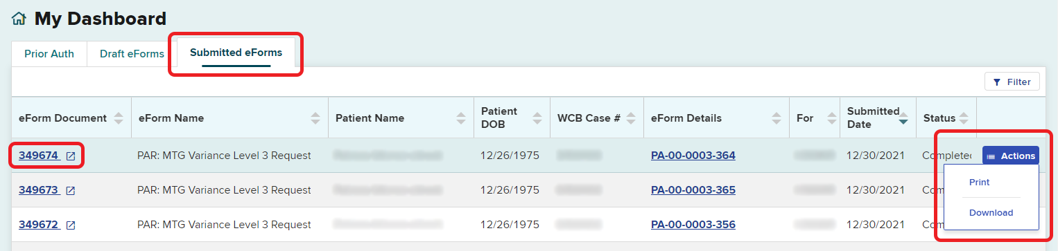 To access submitted documents, select the Submitted eForms tab in your dashboard. Select the eForm Document link to view the document. Select the Actions button in the last column of the document row to print or download the document.