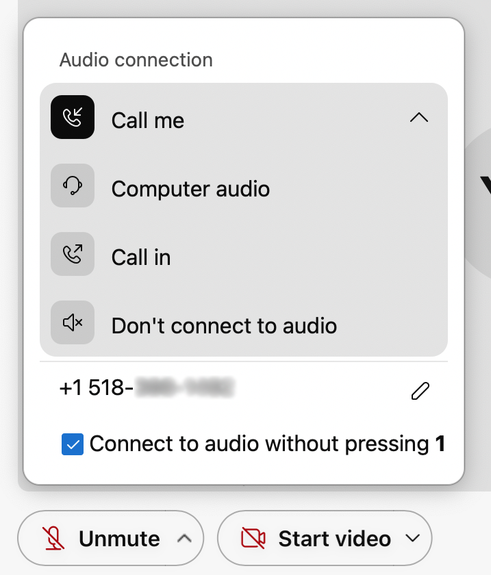 To connect your audio, select "Audio Options." If an audio option connects automatically, use the arrow next to "Unmute" to change your audio option. Your audio connection options will appear. Choose one of the following: