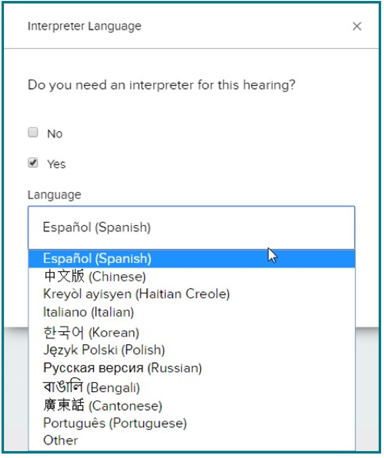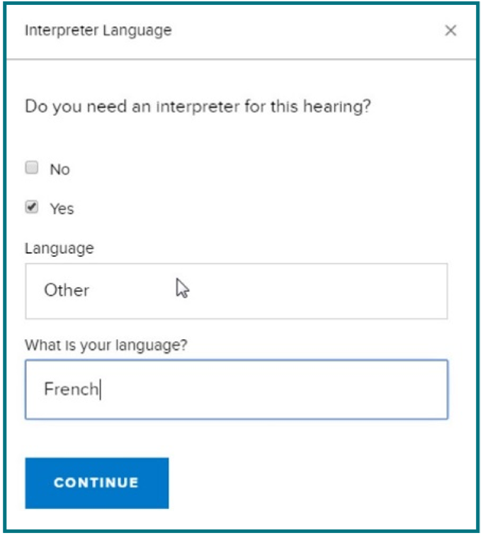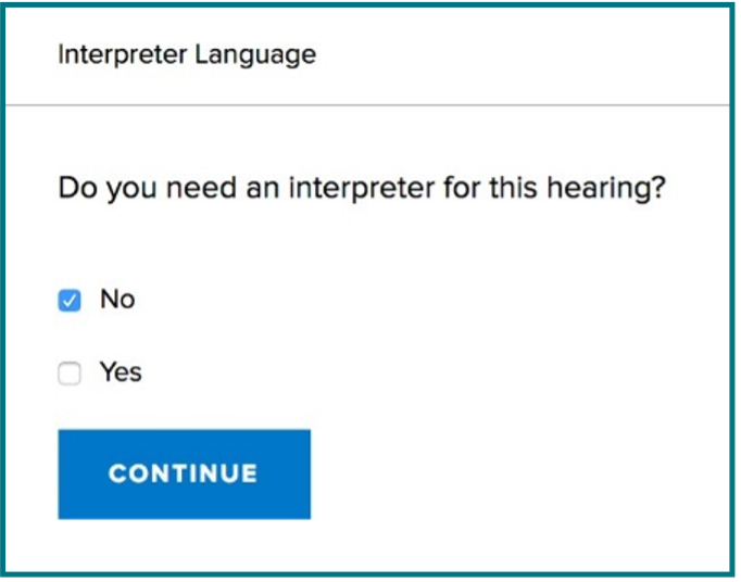 - Select whether you will need an interpreter for this hearing. If you do, choose the language needed. Select Continue.