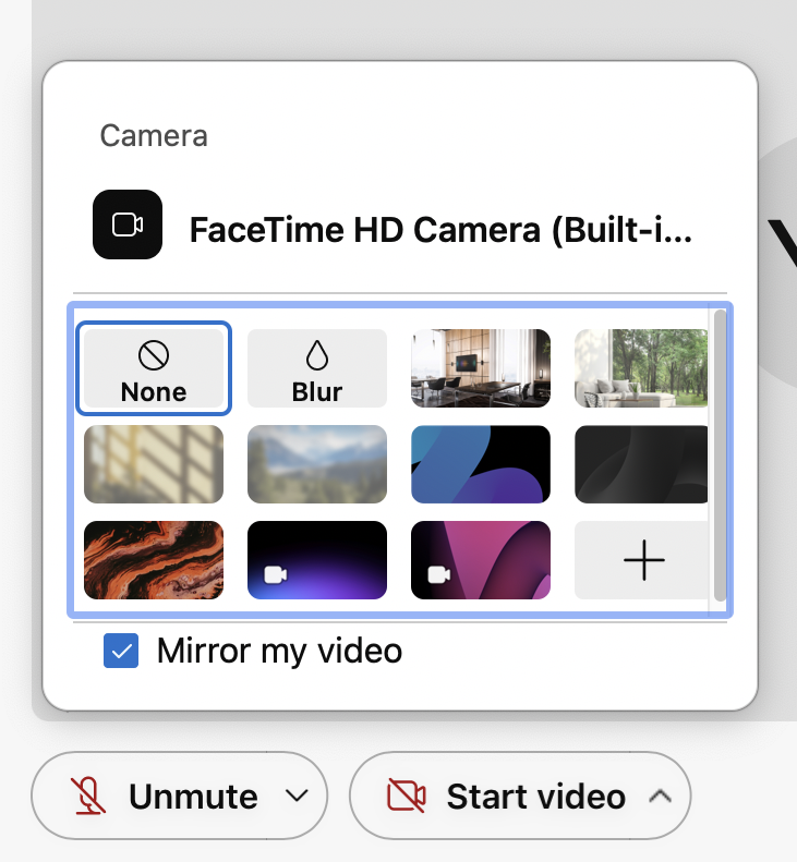 - Next, you will connect your video. To connect your video, select Start video. Your camera options will appear here. Select the camera to use and your video feed will connect. On a mobile device, connect your video with the video camera icon.